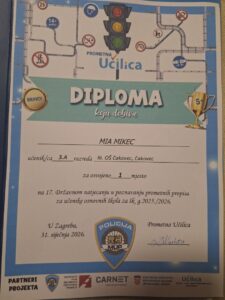 Učenica 3.a razreda, Mia Mikec, ostvarila je izniman uspjeh na 17. državnom Natjecanju u poznavanju prometnih propisa “Prometna učilica”. U konkurenciji učenika trećih razreda iz cijele Hrvatske, Mia je osvojila prvo mjesto u svojoj kategoriji!